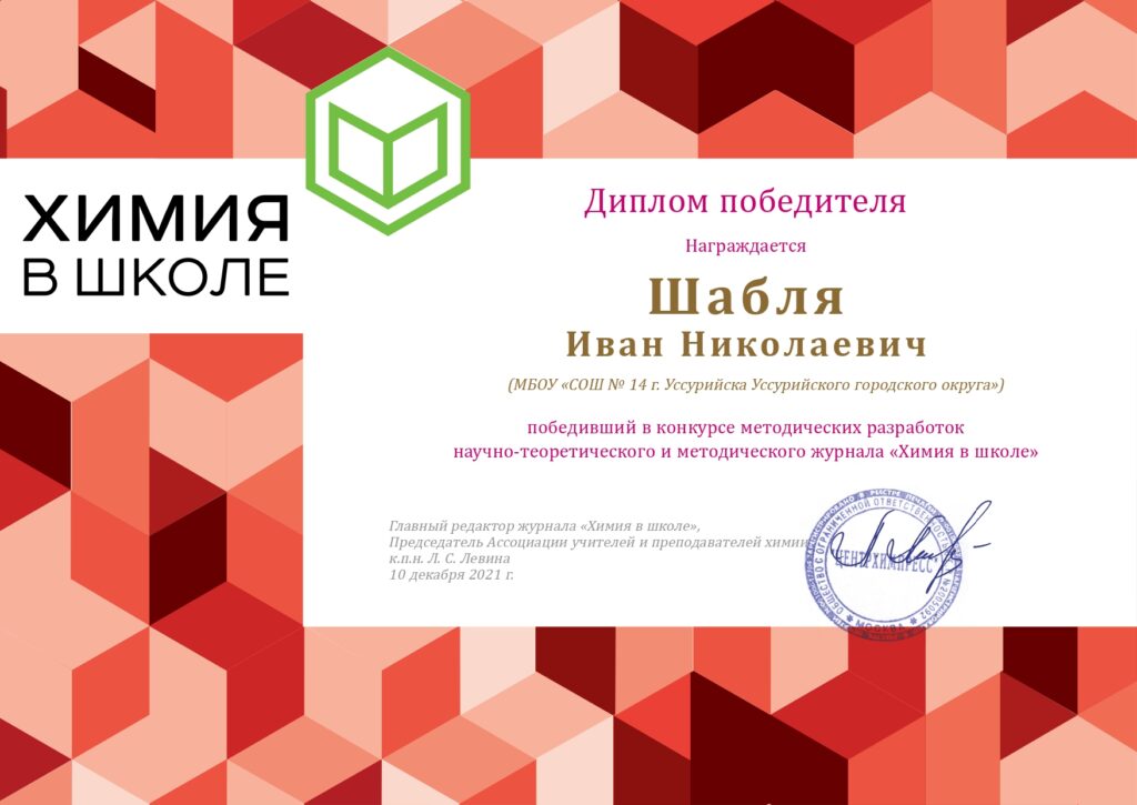 Методическая разработка Ивана Николаевича Шабля «Практико-ориентированный подход при решении расчетных задач», была опубликована в 8 номере журнале «Химия в школе» за 2021г, и по результатам конкурса заняла третье место.