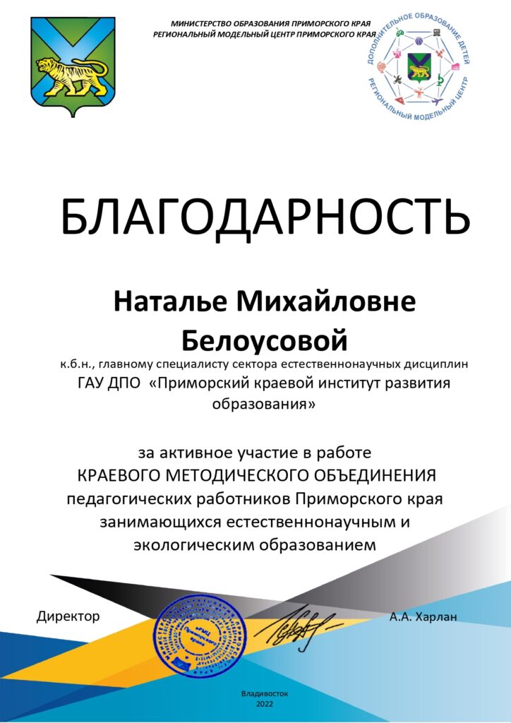 Белоусова Н.М., к.б.н., главный специалист сектора естественнонаучных дисциплин ГАУ ДПО «Приморский краевой институт развития образования» рассказала о возможностях организации опытнической работы на региональном материале и сделала презентацию Учебно-методического пособия «Опытническая работа: учебные исследования обучающихся. Первые шаги к выполнению индивидуального проекта. Региональный аспект».
