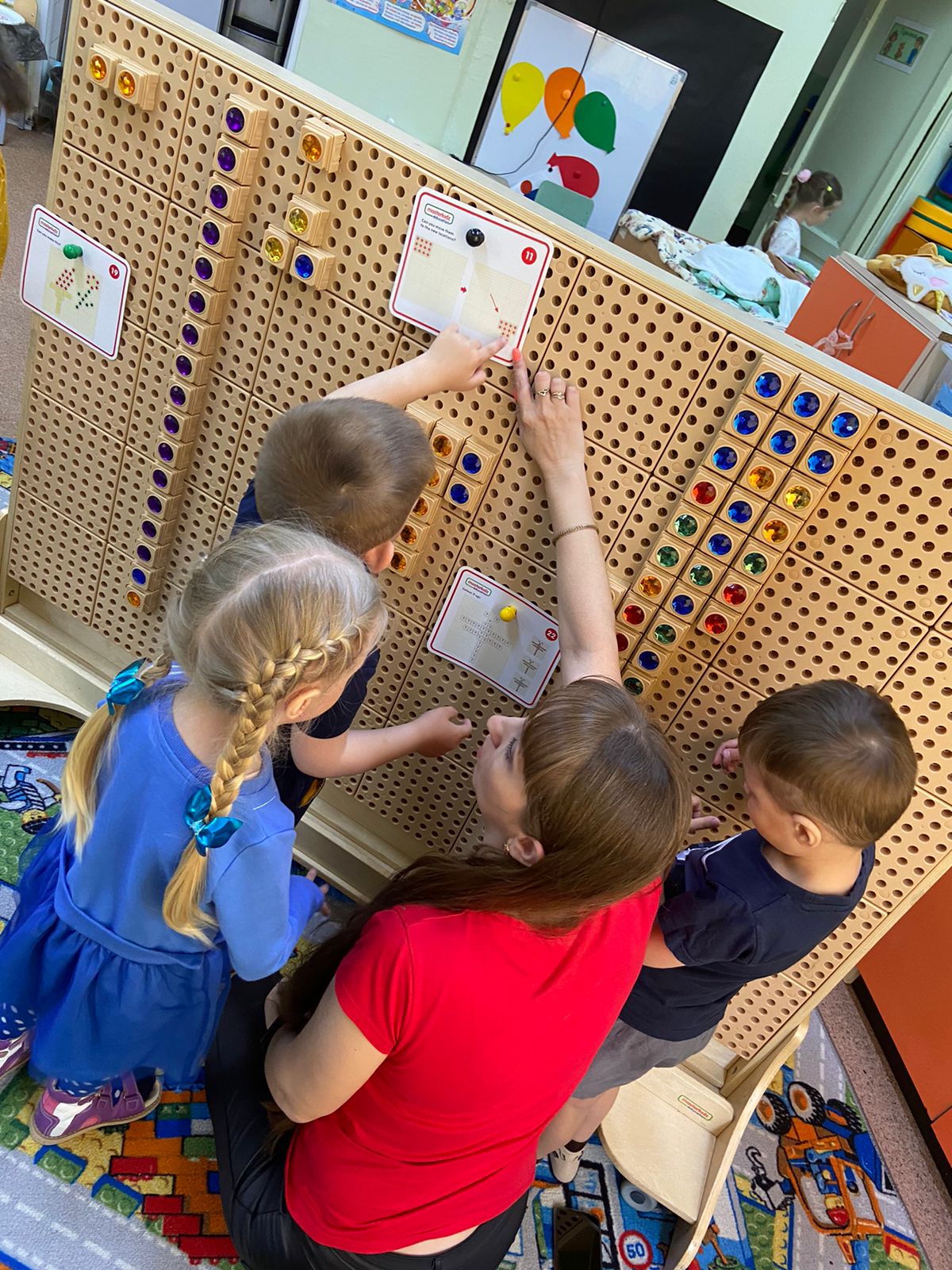 Дети создают последовательные картинки, используют разноцветные колышки, ввинчивают болты, строят зубчатые механизмы из цепи и шестерёнок, которые вращаются!
