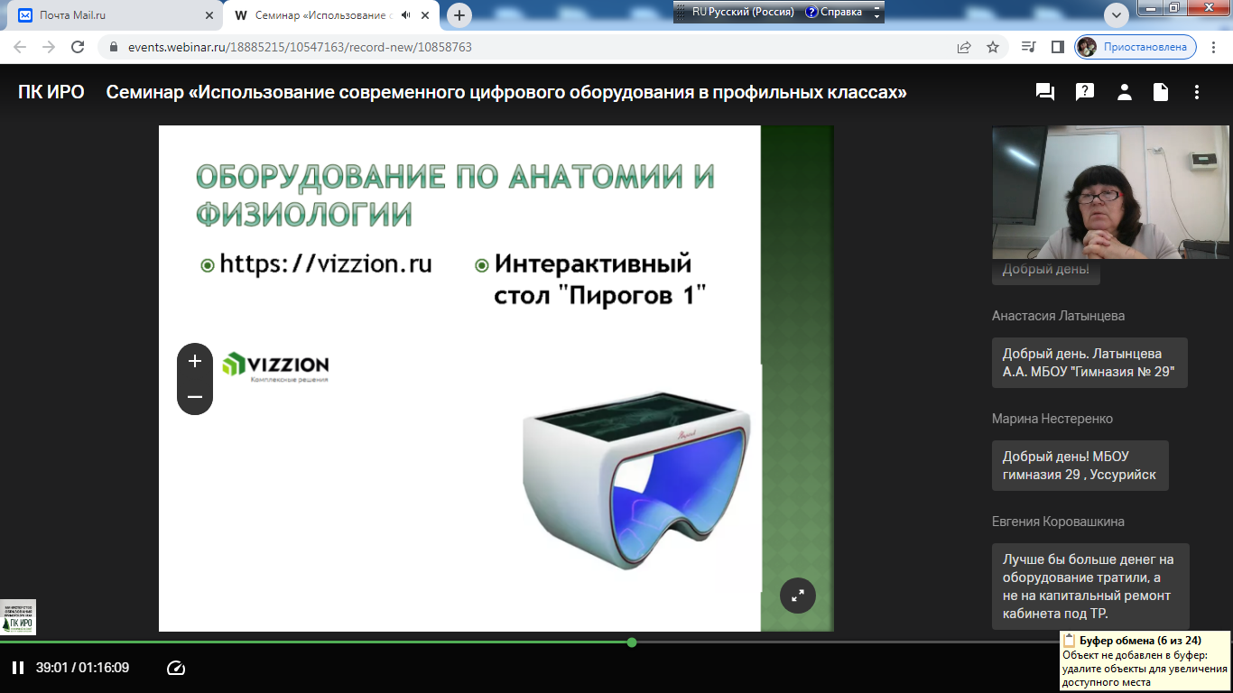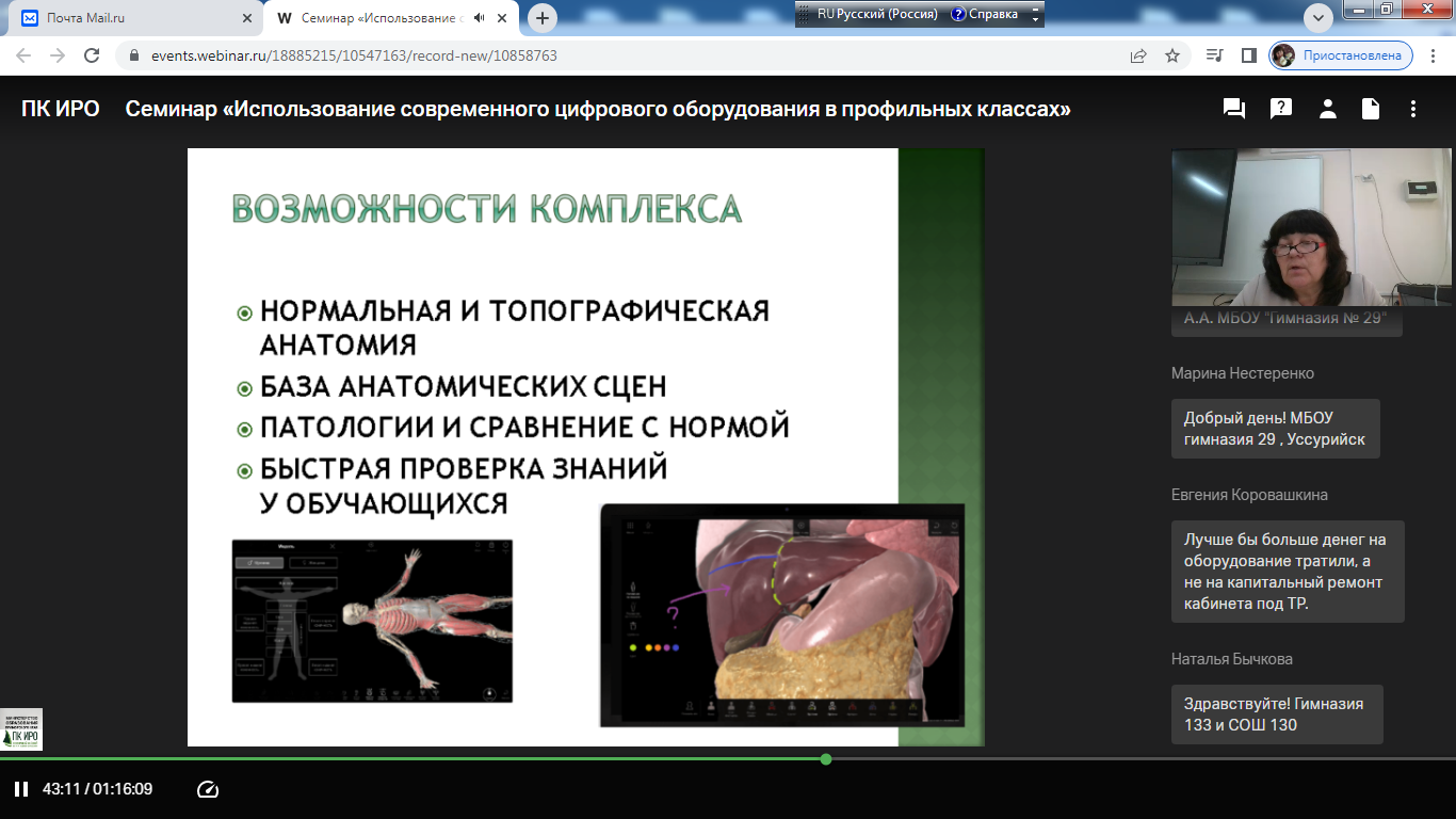 Обсуждались вопросы использования цифрового оборудования лаборатории Releon, Pasco, Sensedisc, Vernier. Обсуждались возможности применения цифровых датчиков для организации исследовательской деятельности по физиологии и экологии для медицинских классов, цифровое оборудование для уроков химии (комплекты для учителя и обучающихся), состав учебно-образовательного набора для знакомства со свойствами воздуха, компьютеризированного комплекса для проведения демонстрационных и лабораторных работ по биологии, экологии, естествознания и возможности применения в учебном процессе интерактивного анатомического стола «ПИРОГОВ».