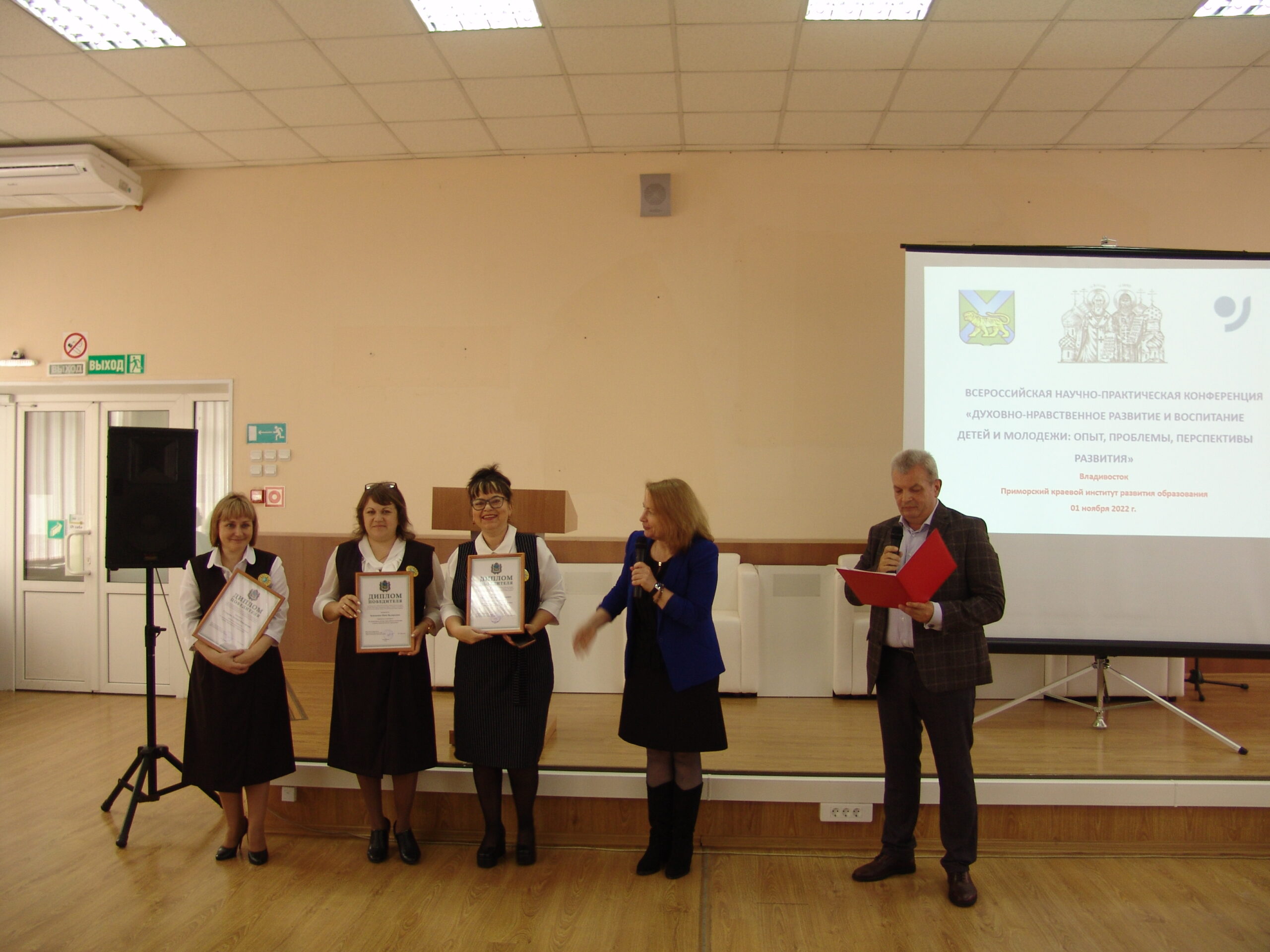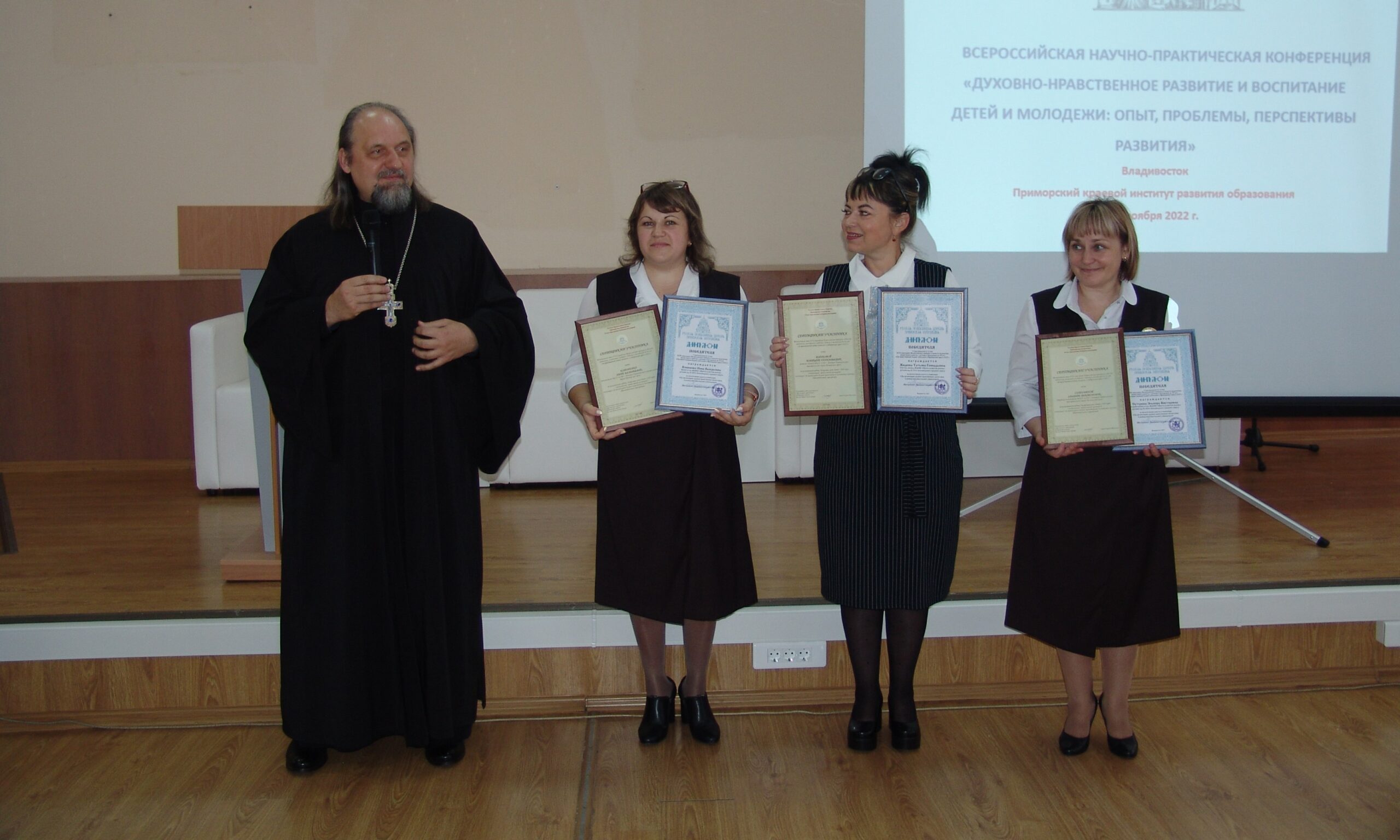 Заместитель министра образования Приморского края Василянская Наталья Вячеславовна, Протоиерей Ростислав Мороз, председатель отдела религиозного образования и катехизации Владивостокской епархии (г. Владивосток) провели процедуру награждения победителей региональных конкурсов 2022 года: «За нравственный подвиг учителя» ; «Воспитать человека» ; «Конкурс среди классных руководителей на лучшие методические разработки воспитательных мероприятий» ; «Растим патриотов Приморья» ; «Лучший учитель основ православной культуры».