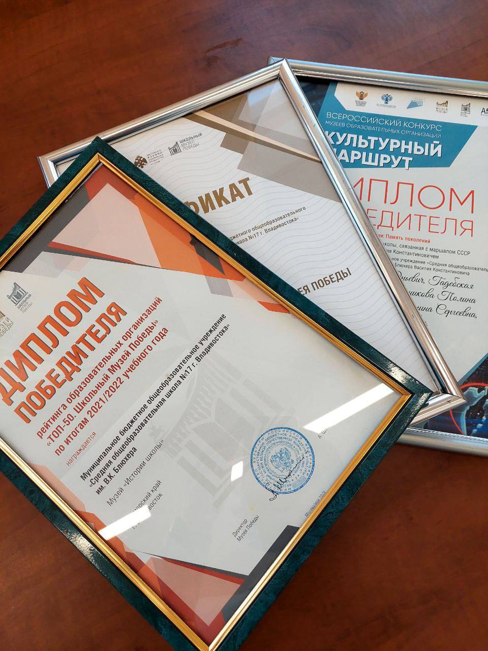 В номинации «Память поколений» победителем стала МБОУ «СОШ №17 г. Владивостока» имени Блюхера В.К. с работой «Вековая история школы, связанная с маршалом СССР Блюхером Василием Константиновичем», руководитель Самойлов Кирилл Юрьевич. Также школа вошла в топ-50 школьных музеев Победы.