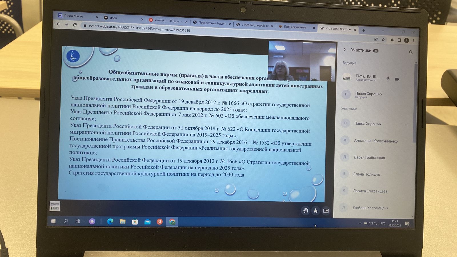 Центр психолого-педагогической, медицинской и социальной помощи Приморского края «Твой Маяк» провел 19 декабря 2022 года вебинар на тему «Организационно-методическое сопровождение образовательной организации по вопросам разработки адаптивной образовательной основной программы (АООП) для обучающихся с ограниченными возможностями здоровья из числа несовершеннолетних иностранных граждан, подлежащих обучению по образовательным программам дошкольного, начального общего, основного общего и среднего общего образования».
