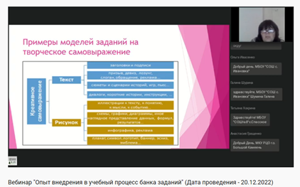 Участники вебинара ознакомились с характером заданий из открытой базы и критериями оценки уровня сформированности креативного мышления; ознакомились вариантами заданий, разработанных лучшими педагогами школ Приморья и получили идеи для разработки таких заданий на региональном материале.