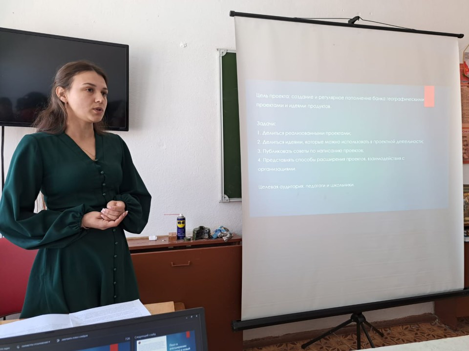 Следующим тактом заседания была презентация «Педагогических проектов». Свой первый профессиональный проект представила молодой педагог Федорова Лилия Александровна. Тема ее проекта «Банк идей для проектов по географии». Всеми своими идеями молодой педагог делится на страничке в ВК:1 https://vk.com/