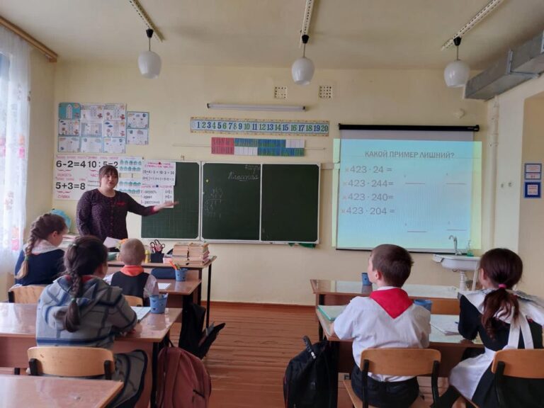 Наставники и молодые коллеги посетили урок математики в 4 классе, который, несомненно, отличался от урока в классическом варианте, ведь Александра Руслановна работает в малокомплектном классе. В школе учится всего 32 ребенка, а в деревне живет чуть более 200 человек. Понятно, что школа в таком населенном пункте является социокультурным центром и средоточием общественной жизни. Понимаешь, какая ответственность лежит на молодом учителе, который  в неблагополучных социальных условиях является для ребят, особенно младших школьников, образцом нравственного и гражданского поведения. Таким учителем стала для маленьких школьников Александра Руслановна. Несмотря на непростые, специфические условия организации учебно-воспитательного процесса в малокомплектных  классах, молодой специалист проявила себя как профессионал, компетентный педагог, готовый к саморазвитию и самосовершенствованию.