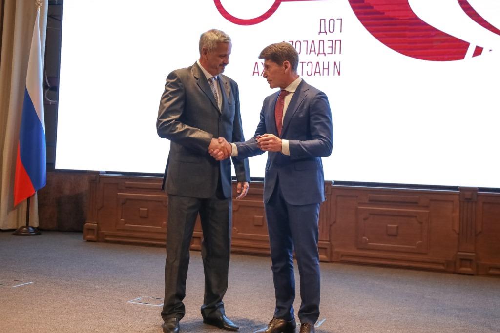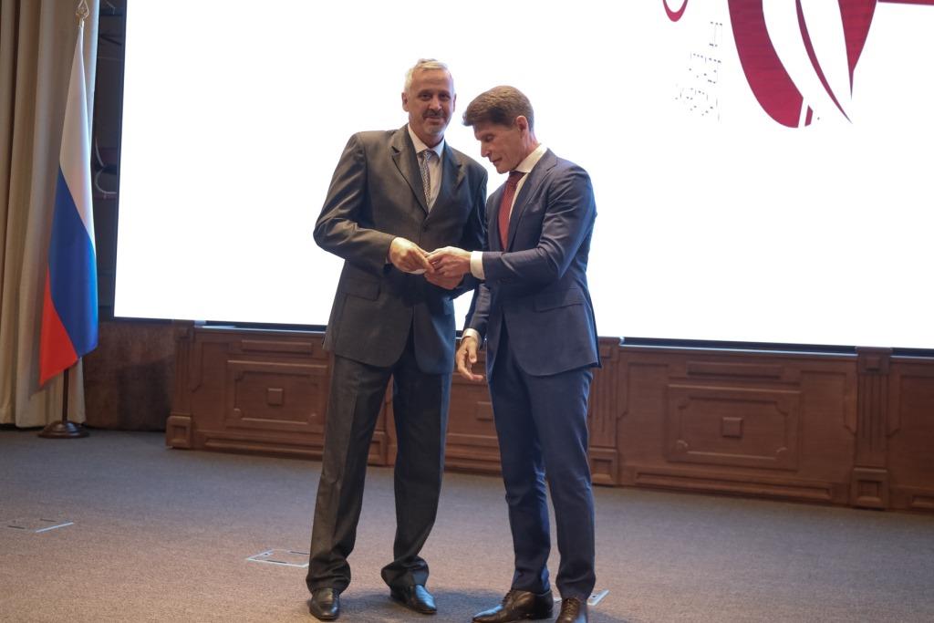 За многолетний и плодотворный труд в образовательных организациях Олег Кожемяко вручил награды Министерства просвещения России. Нагрудный знак «За верность профессии» получили педагог дополнительного образования филиала Нахимовского военно-морского училища Игорь Бажанский, воспитатель детского сада №15 «Солнышко» села Хороль Екатерина Кожеченкова, учителя-дефектологи коррекционной начальной школы – детского сада II вида Владивостока Элеонора Козлова и Раиса Удалова, учитель школы №16 Черниговского округа Людмила Кузнецова, воспитатель Центра развития ребенка – детского сада №28 поселка Восток Елена Тучинова.