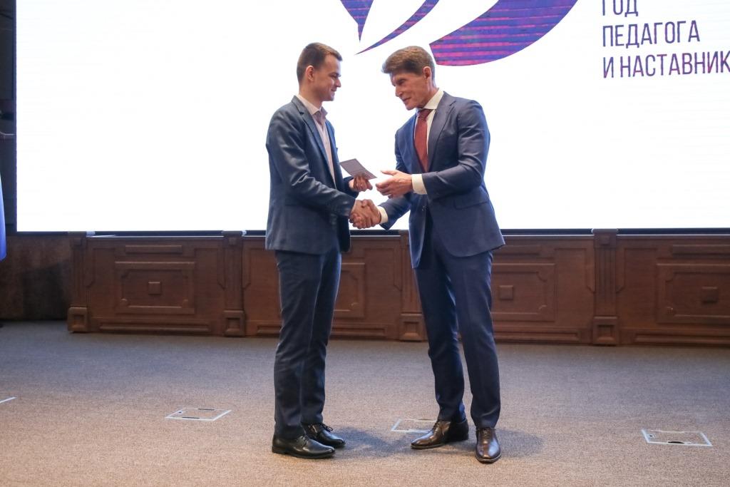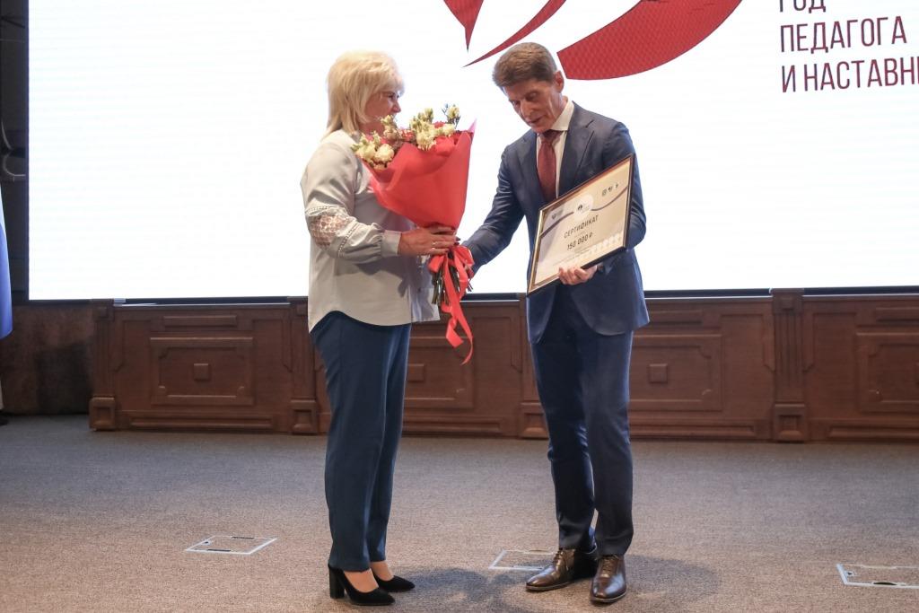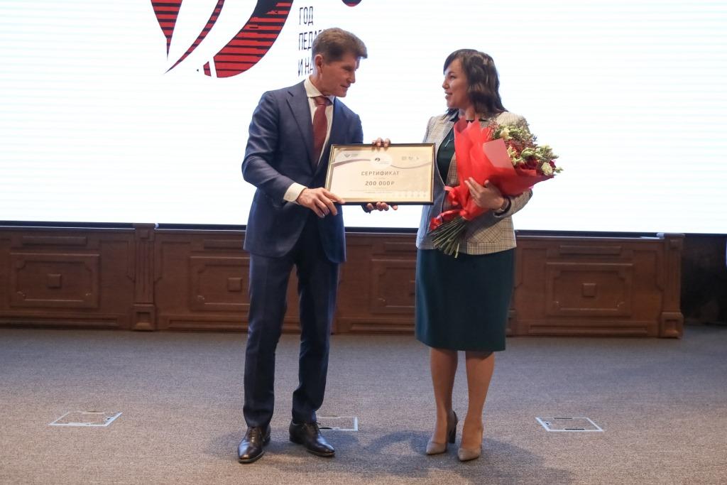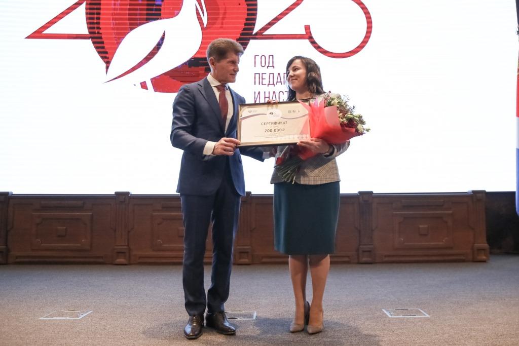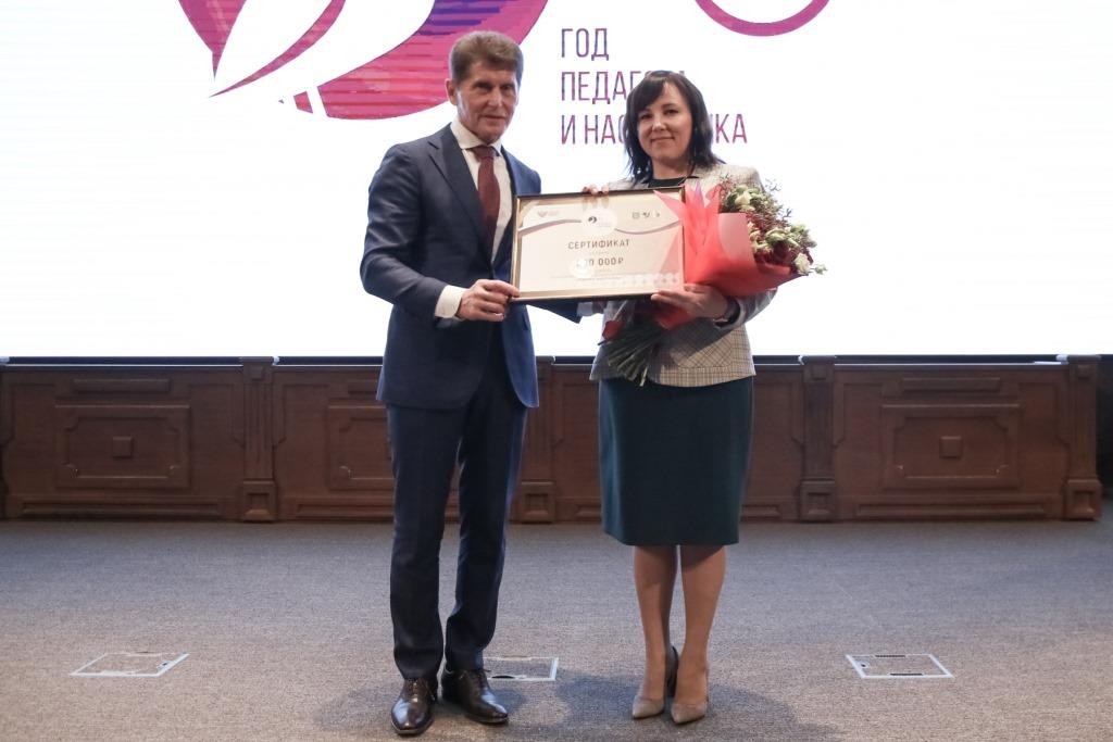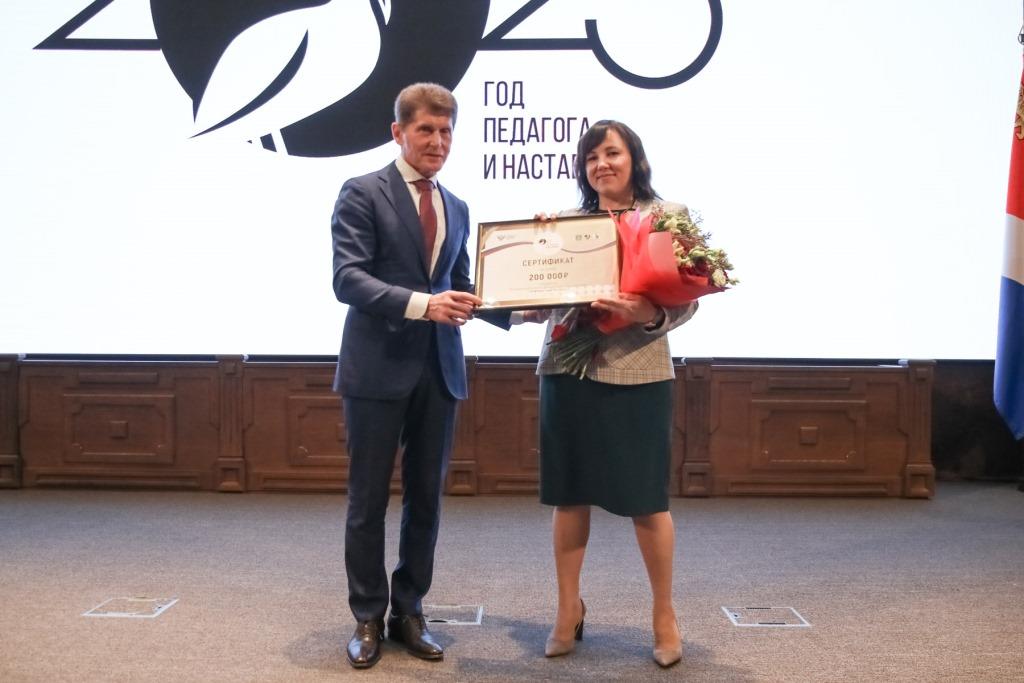 Денежные сертификаты за призовые места в конкурсе «Учитель года России – 2023» получили учитель школы №24 Уссурийска Валентина Смищук, учитель школы №1 села Вольно-Надеждинское Юлия Слободенюк и учитель школы №2 поселка Кавалерово Владимир Давыдов.