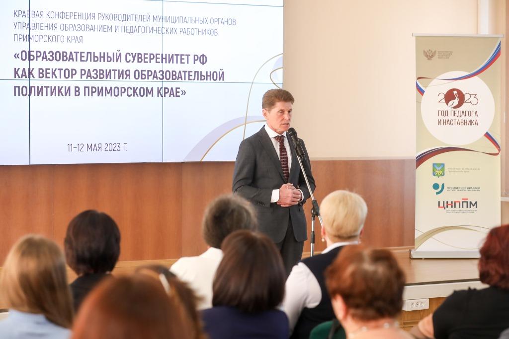 Торжественное открытие краевой конференции руководителей муниципальных органов управления образованием и педагогических работников Приморья состоялось 11 мая 2023 года. Глава региона Олег Кожемяко поблагодарил участников семинара-совещания за плодотворную работу и вручил отличившимся педагогам государственные и краевые награды.