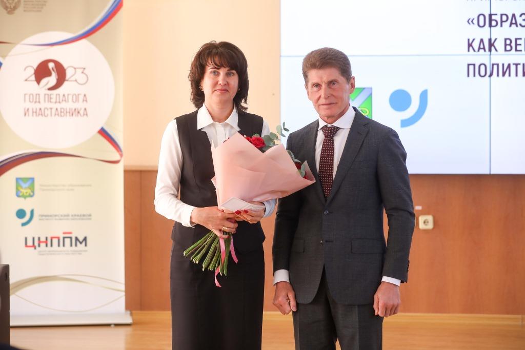 Также Олег Николаевич поблагодарил педагогов за высокий профессионализм, особую ответственность и преданность к делу. Нагрудного знака Министерства просвещения России «Почетный работник сферы образования Российской Федерации» удостоились учитель школы №25 Владивостока Ольга Талыпова, заместитель заведующего по воспитательной и методической работе Центра развития ребенка – детского сада №3 Владивостока Ирина Вербицкая, начальник управления образованием Михайловского района Алена Чепала, педагог-психолог Центра содействия семейному устройству детей-сирот и детей, оставшихся без попечения родителей, Уссурийска Светлана Лебедева и директор Центра творческого развития и гуманитарного образования Артема Римма Ляпунова.
