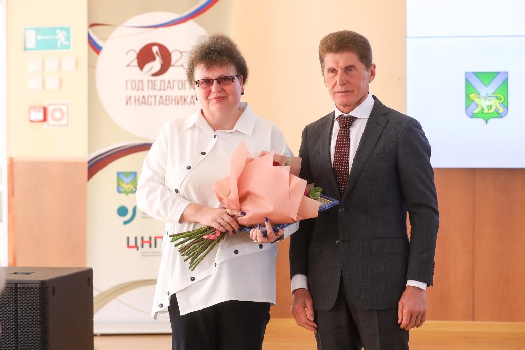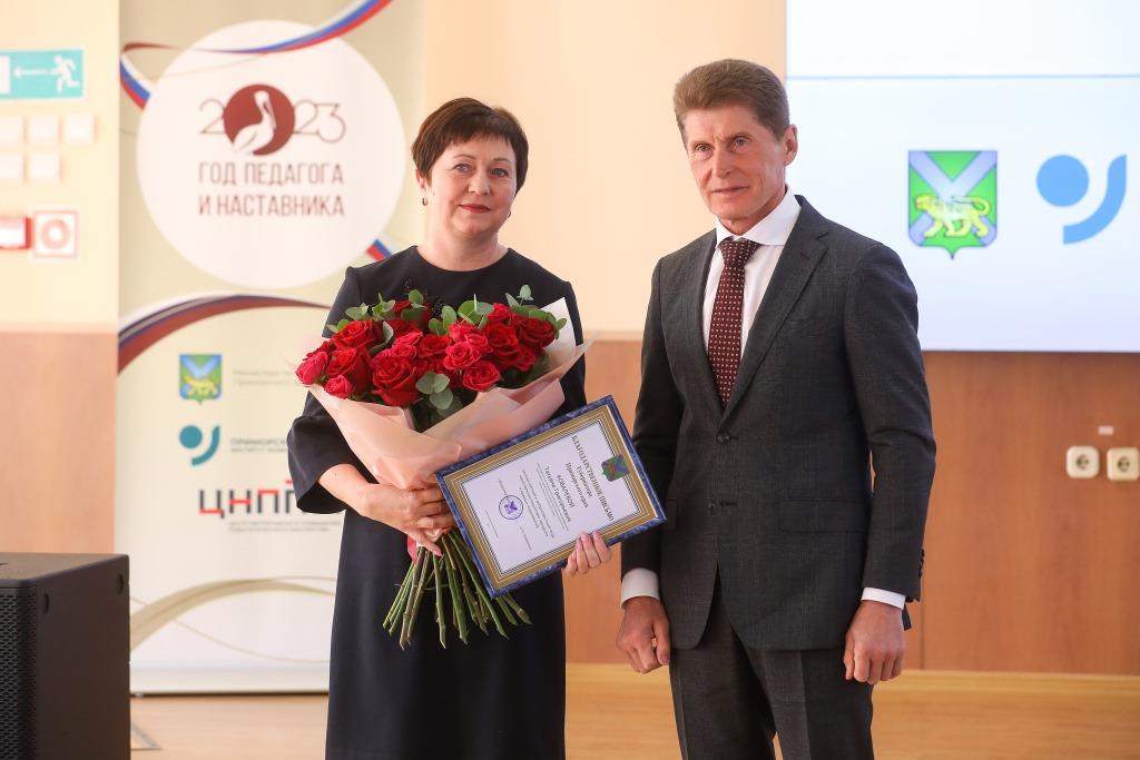 Благодарственные письма Губернатора Приморского края Олег Кожемяко вручил директору школы №10 Арсеньева Татьяне Ковалевой, директору Центра информационно-методической и хозяйственно-эксплуатационной работы Артема Екатерине Горобец и заместителю директора по научно-методической работе гимназии №1 Владивостока Ларисе Букиной.