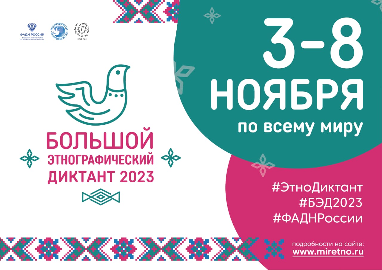 С 3 по 8 ноября 2023 года пройдет ежегодная Международная просветительская акция «Большой этнографический диктант», которая знакомит с культурой народов, проживающих в России, а также позволяет оценить общий уровень этнокультурной грамотности.