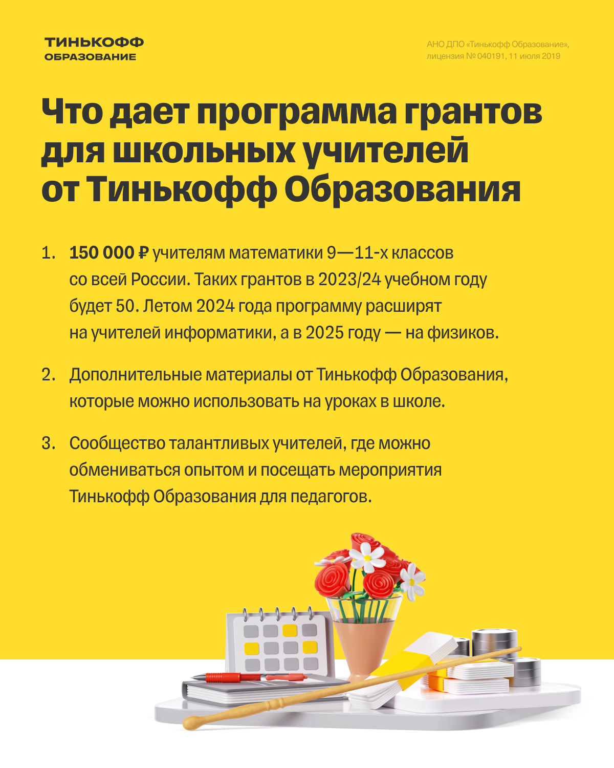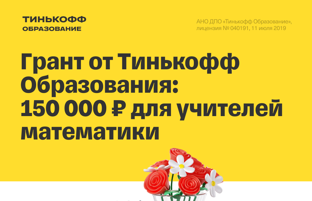 Тинькофф запускает программу «Вклад в поколение»: 50 грантов по 150 000 ₽ для школьных учителей математики.