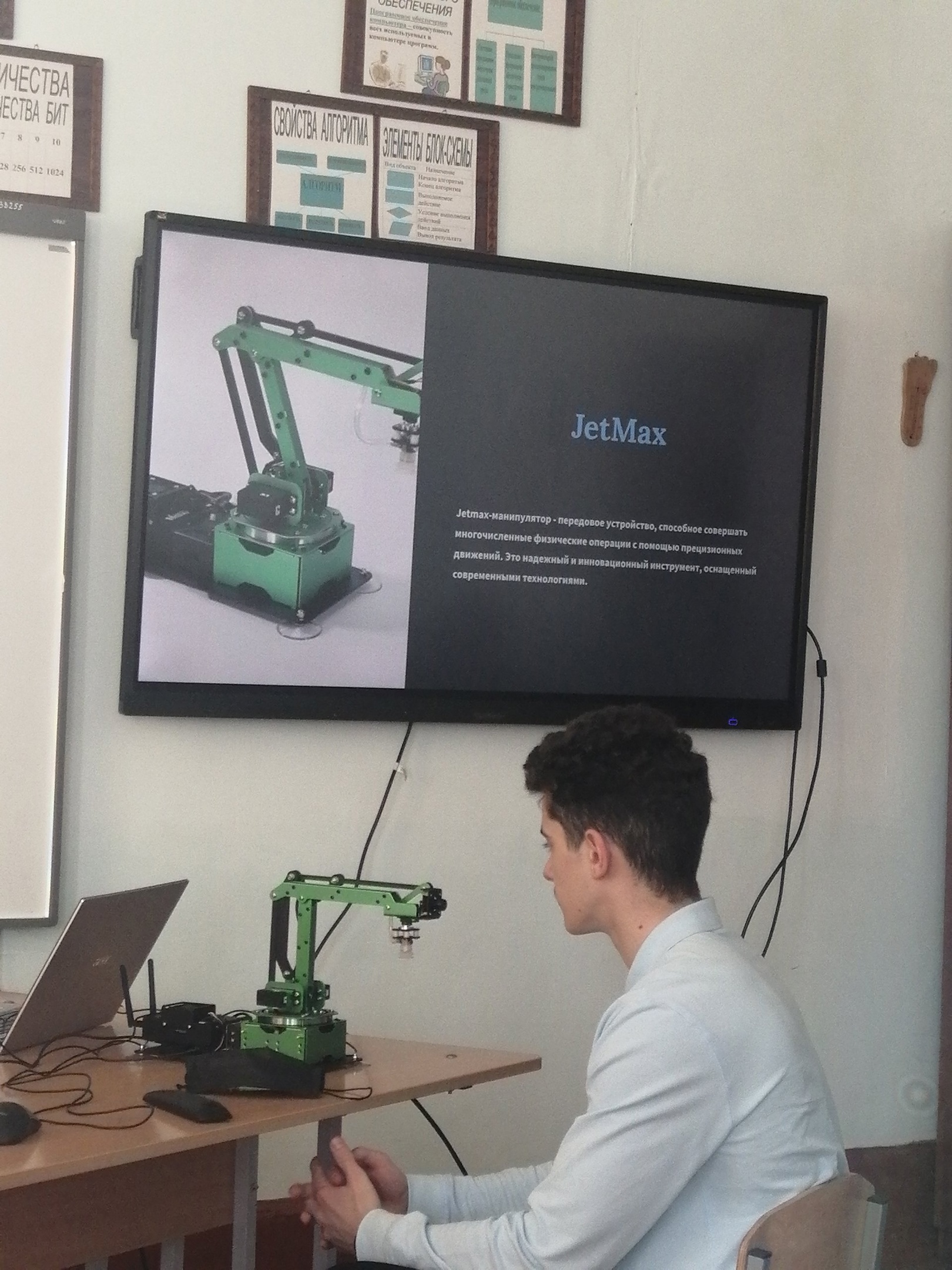 Учитель информатики Мироненко Галина Алексеевна провела внеурочное занятие в рамках ранней профориентации «Роботизированный манипулятор JetMax как основа работы искусственного интеллекта», а её ученики со знанием дела продемонстрировали возможности робота JetMax.