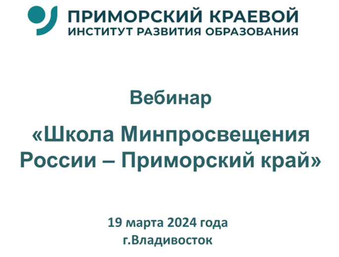 В рамках реализации проекта  «Школа Минпросвещения» и проекта по повышению качества общего образования в Приморском крае на площадке ГАУ ДПО ПК ИРО 19.03.2024г. состоялся вебинар «Школа Минпросвещения России – Приморский край» для специалистов муниципальных методических служб, кураторов проекта «Школа Минпросвещения России» в общеобразовательных организациях и членов школьных команд – участников проекта «Школа Минпросвещения России».