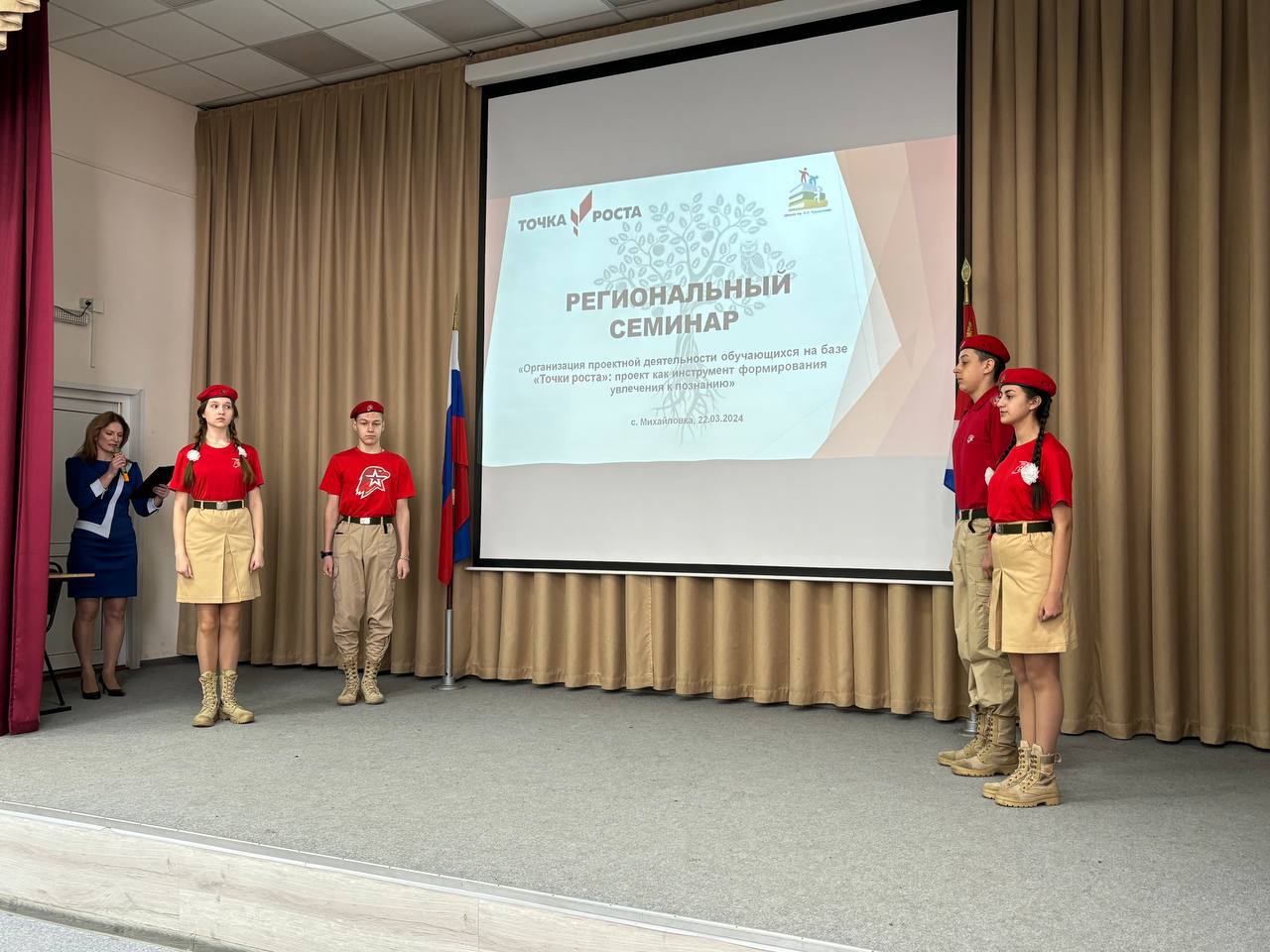 22 марта в Муниципальном бюджетном общеобразовательном учреждении «Средняя общеобразовательная школа имени А.И. Крушанова с. Михайловка» состоялся семинар «Организация проектной деятельности обучающихся на базе «Точки роста»». В семинаре приняли участие 50 руководителей и учителей из 10 муниципальных районов нашего края.