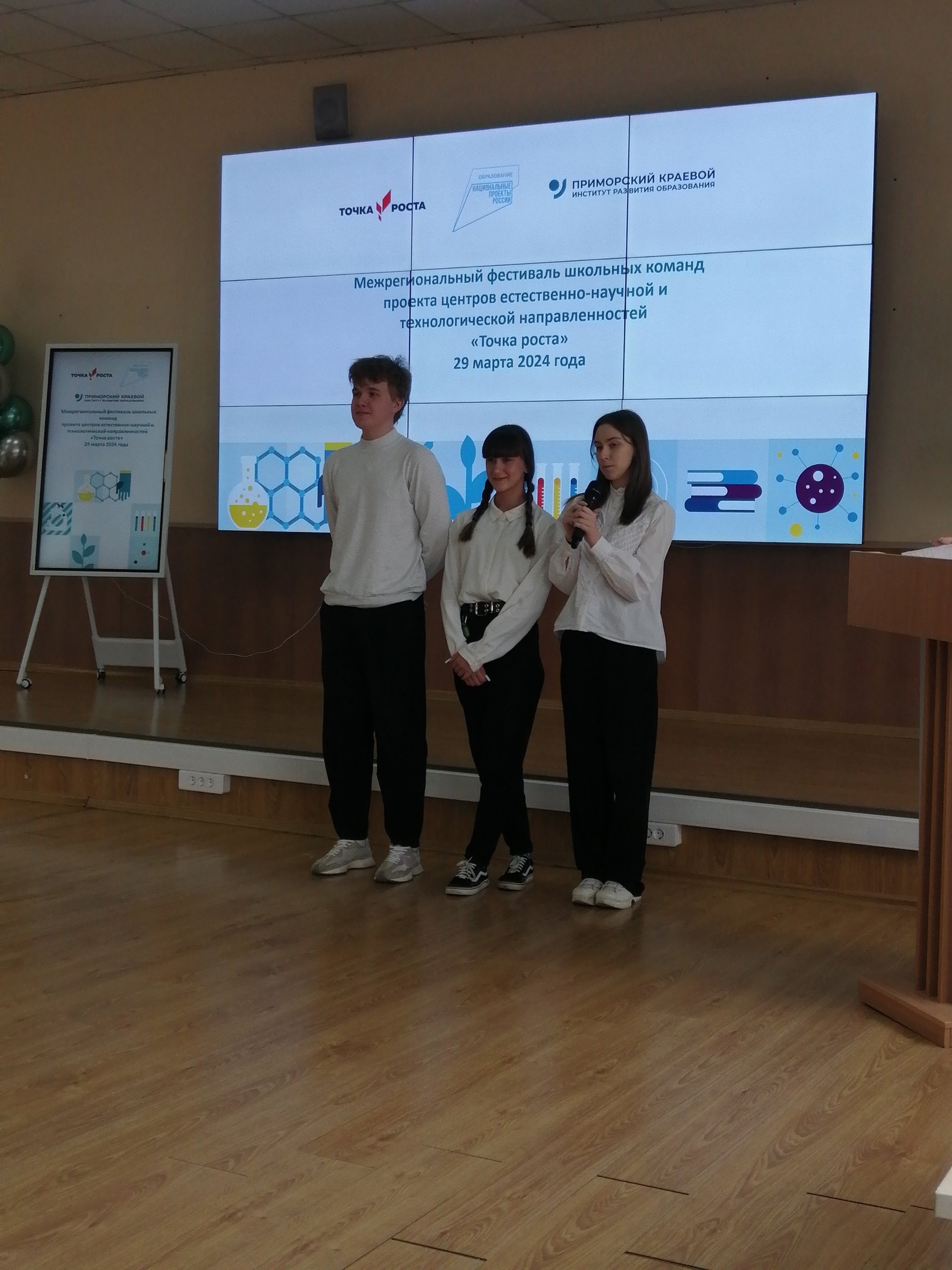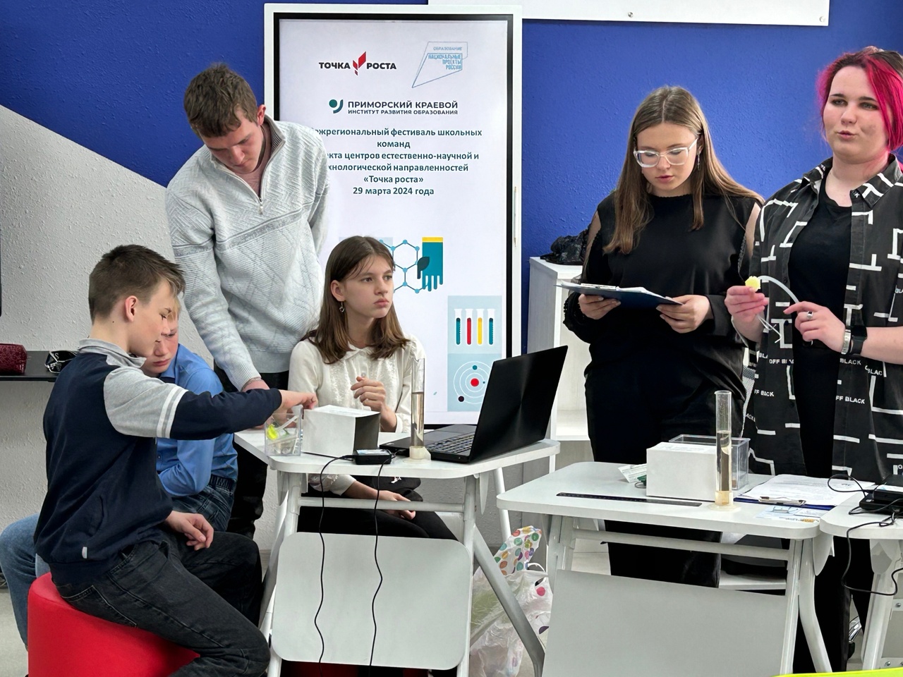 29 марта 2024 года состоялся Межрегиональный фестиваль школьных команд участниц проекта центров научно-технической направленности «Точка роста», фестиваль проводился для учащихся 3 – 11 классов образовательных организаций Приморского края на базе которых функционируют центры «Точка роста». Оператор конкурса – ГАУ ДПО ПК ИРО.
