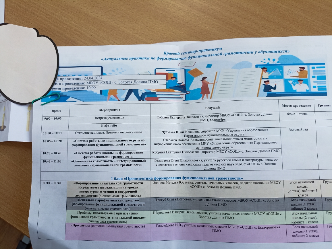24 апреля 2024 г. на базе МОБУ «СОШ с. Золотая Долина» Партизанского муниципального округа состоялся региональный семинар по теме «Актуальные практики по формированию функциональной грамотности у обучающихся». В мероприятии приняли участие муниципальные и школьные координаторы по формированию функциональной грамотности Находкинского ГО, г. Партизанска, ГО Большой Камень, ГО ЗАТО Фокино, Шкотовского, Партизанского, Лазовского муниципальных округов.
