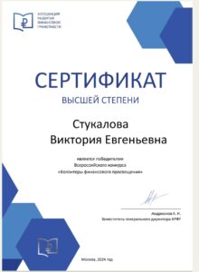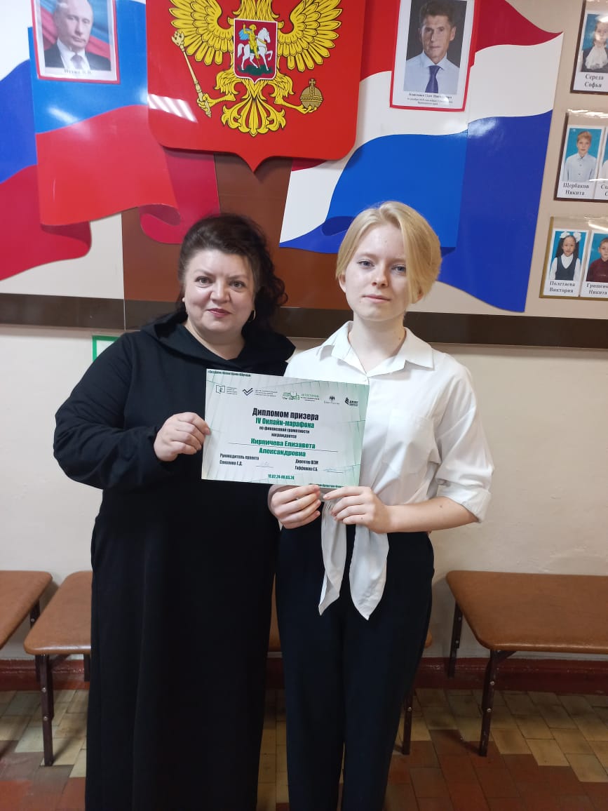 Кирпичева Елизавета также стала призером IV Всероссийского онлайн-марафона по финансовой грамотности для школьников 8-11 классов.