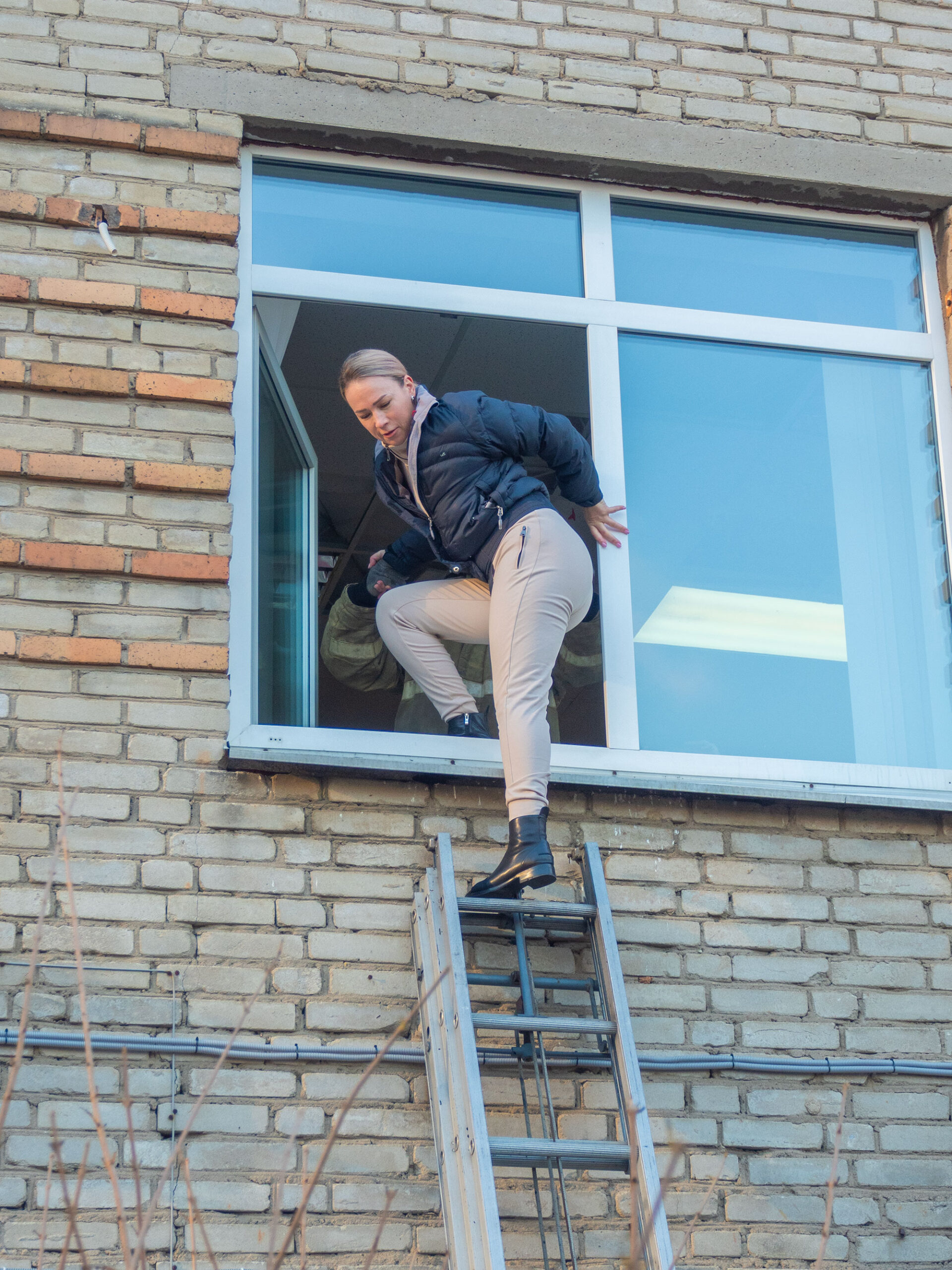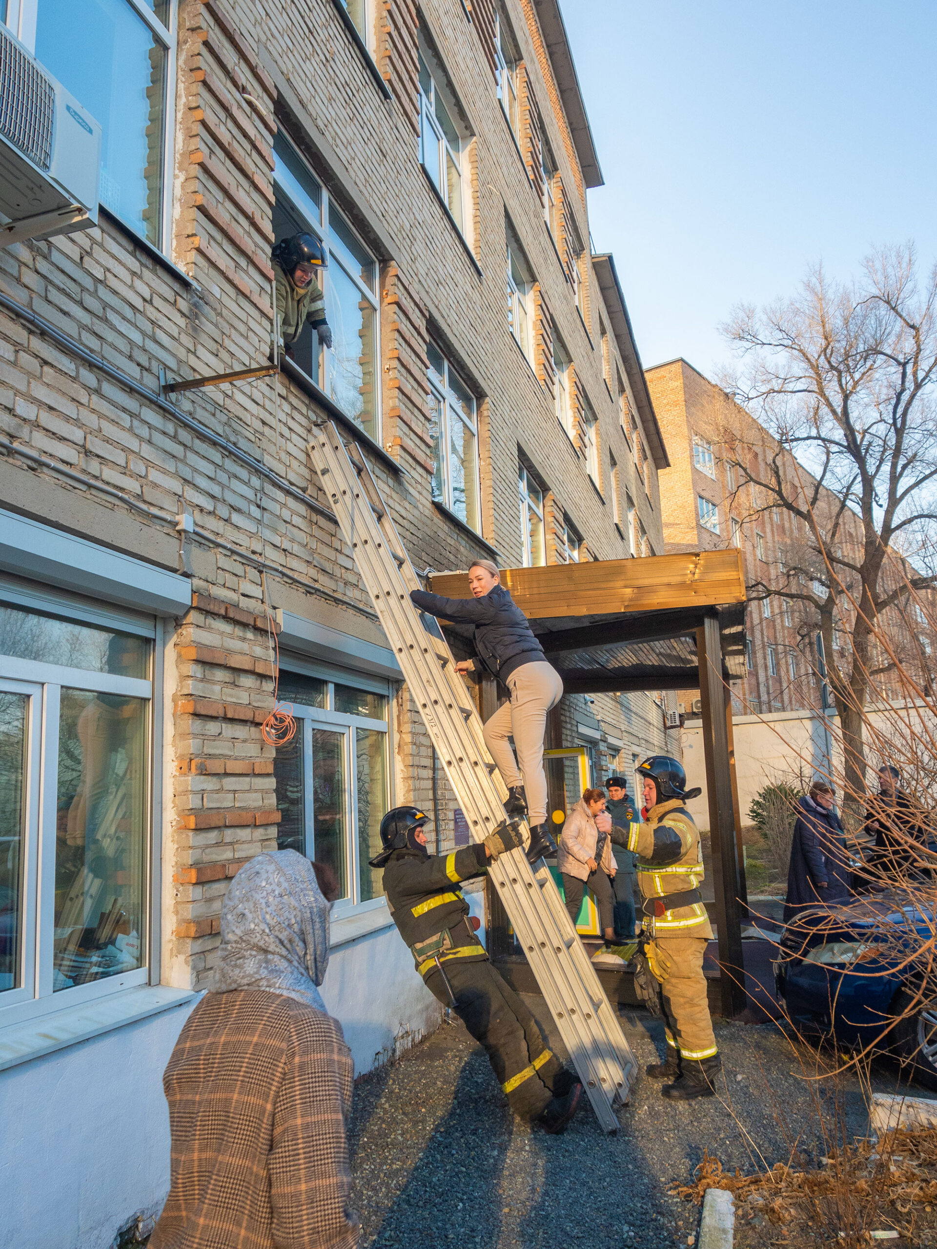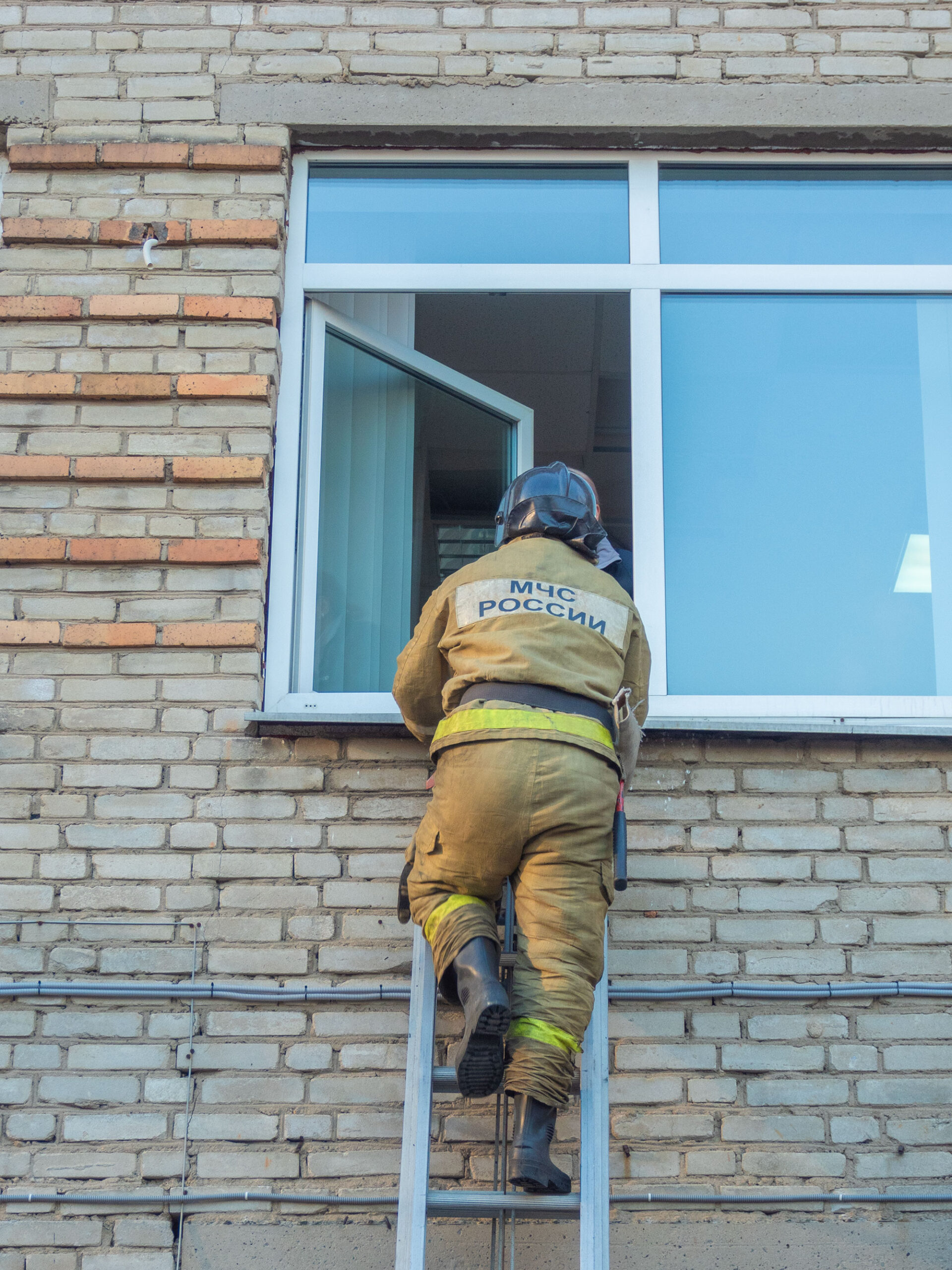 Во время условного пожара одна из сотрудниц оказалась заблокированной в кабинете и была спасена помощником начальника караула 3-ПСЧ Юрченко Р.Ю. через оконный проем с использованием трехколенчатой выдвижной лестницы.