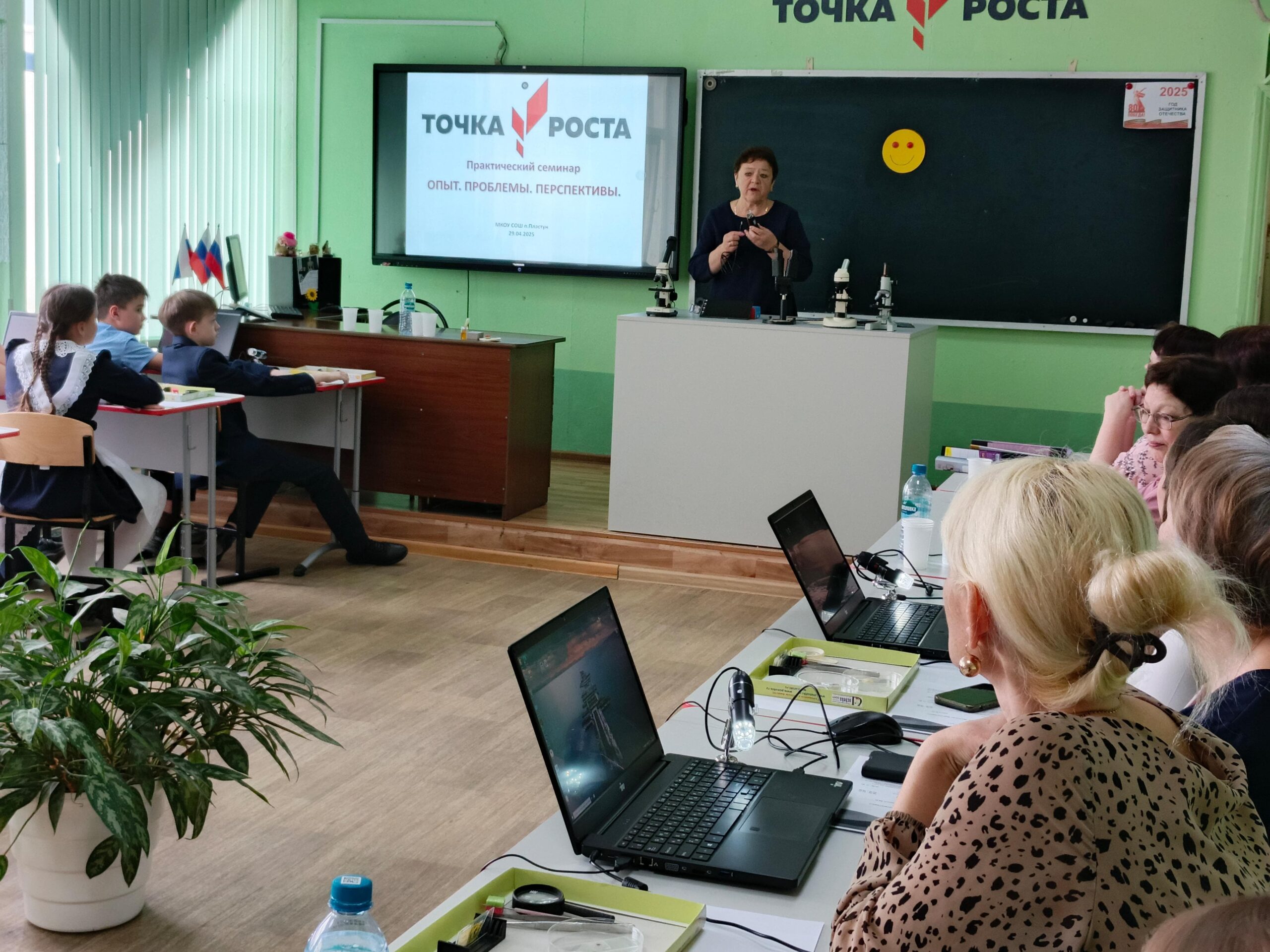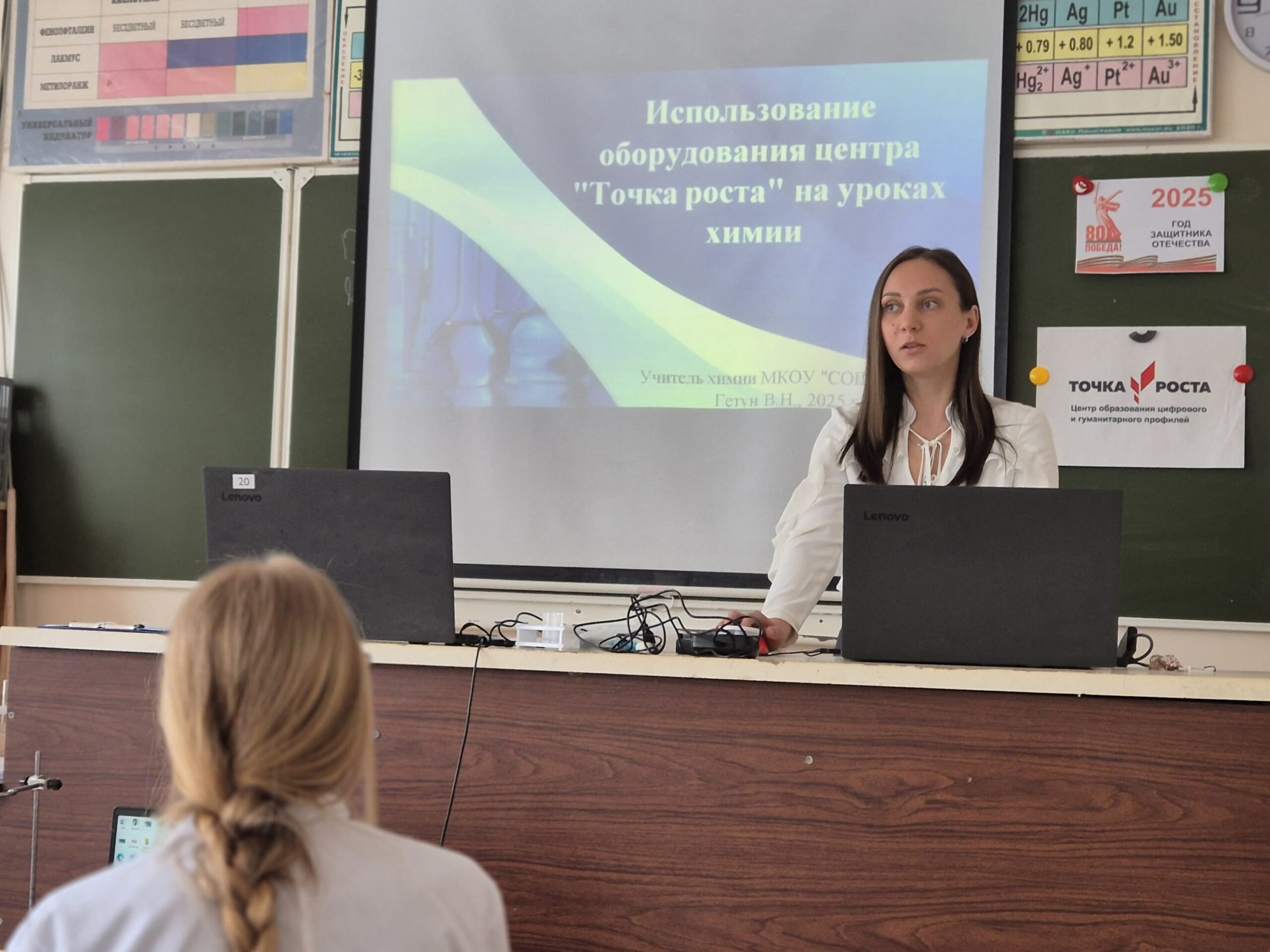 Гетун Виктория Николаевна, учитель химии, поделилась опытом работы с оборудованием «Точки роста» в п.Терней. Она показала элемент урока и провела мастер-класс «Использование оборудования «Точки роста» на уроках химии».