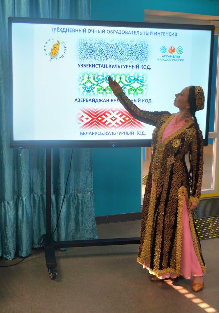 За это время участники интенсива познакомились с удивительным миром народов, проживающих в Приморском крае, которые сохраняют свои культурные традиции, при этом, с большим уважением и любовью относятся к России, а так же гордятся тем, что живут в Приморском крае в мире и согласии. Ребята не только познакомились с особенностями национального костюма каждого народа, но и имели возможность примерить костюмы народов дружественных стран. Такие занятия дают возможность для новых знакомств и дружбы между детьми.