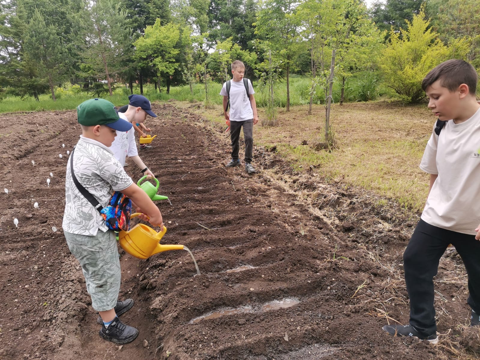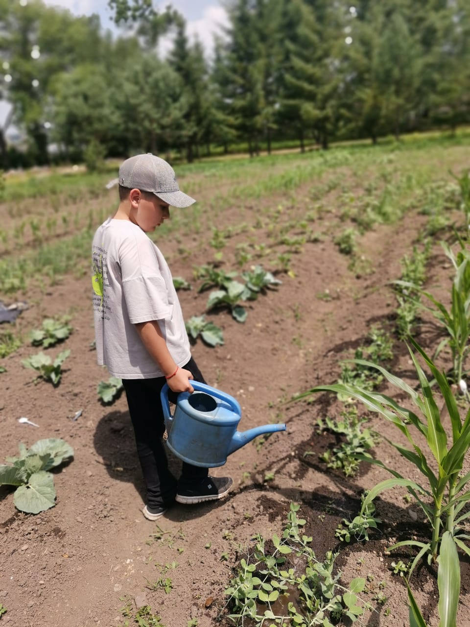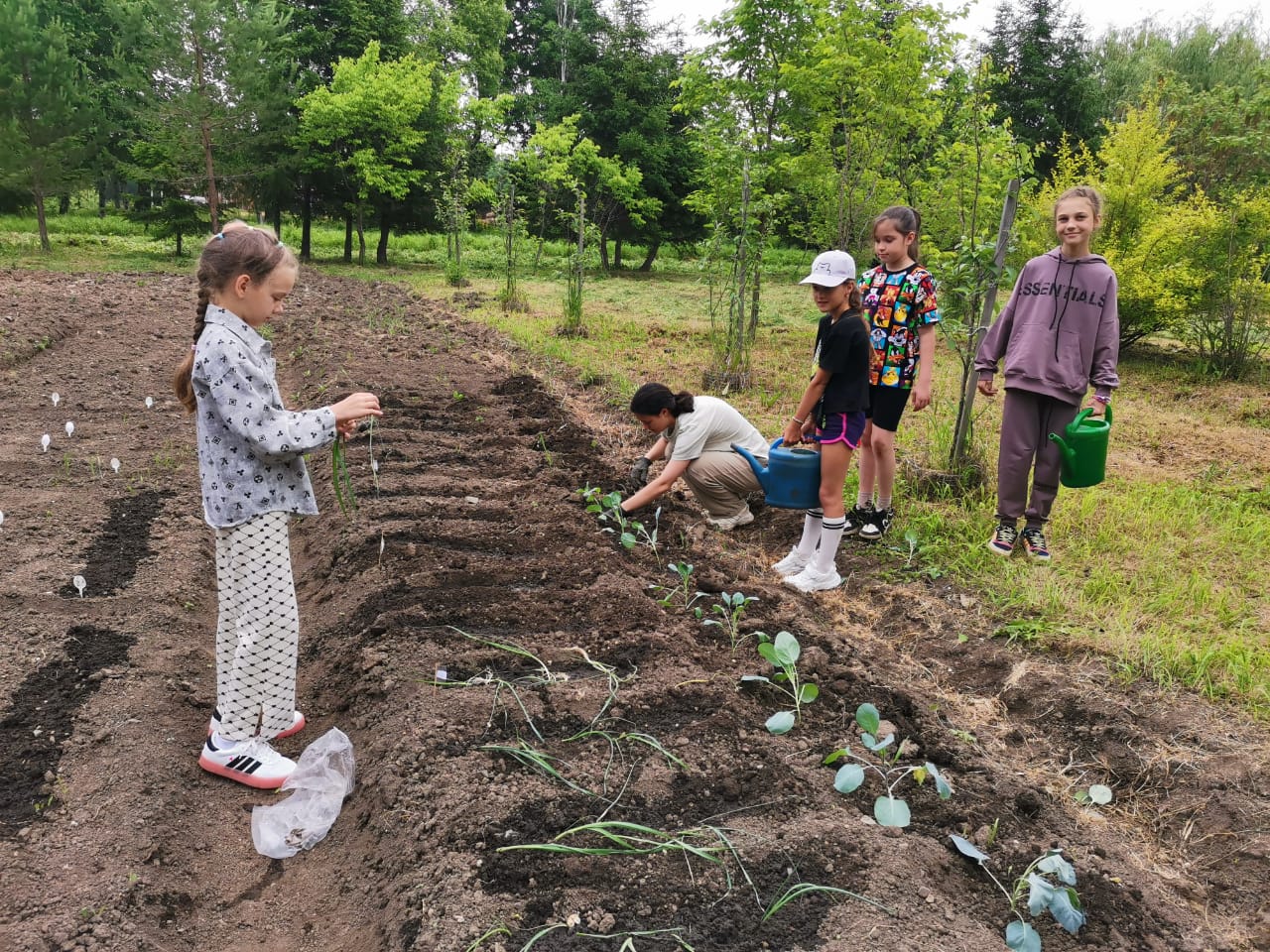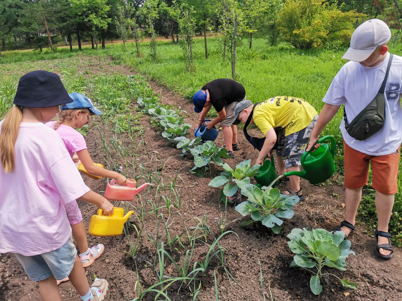На приусадебном участке отделения экологии и туризма Центра внешкольной работы Арсеньевского городского округа все лето ведется работа по уходу за посадками гороха, лука-порея и брюссельской капусты. В посадке и поливе растений участвуют ребята, посещающие летний оздоровительный лагерь «Юннат».