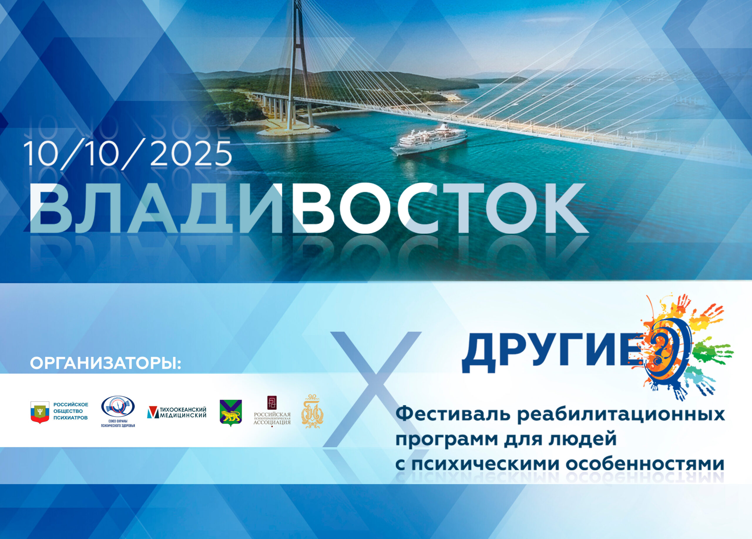 10 октября 2025 года Союз охраны психического здоровья (г. Москва) при сотрудничестве с Министерством здравоохранения Приморского края, ФГБОУ ВО «Тихоокеанский государственный медицинский университет» Минздрава России, Российским обществом психиатров, Российской психотерапевтической ассоциацией, Федеральным консультативно-методическим центром по психотерапии ФГБУ «НМИЦ ПН им. В.М. Бехтерева» Минздрава России, планирует проведение X Фестиваля реабилитационных программ для людей с психическими особенностями «Другие?» во Владивостоке, который будет адресован организациям Дальневосточного федерального округа.