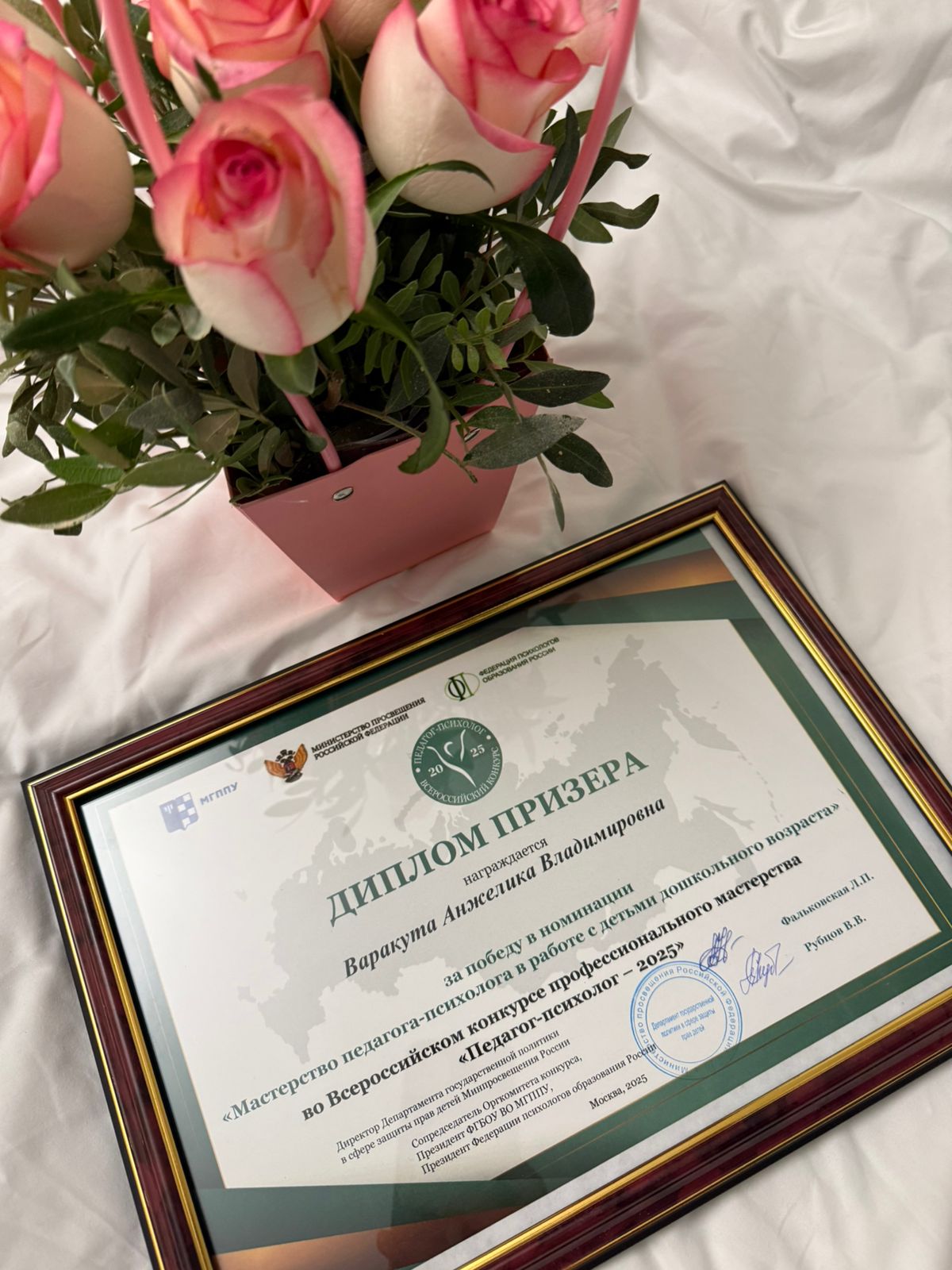 Анжелика Владимировна, стала призером в номинации «Мастерство педагога-психолога в работе с детьми дошкольного возраста» Всероссийского конкурса профессионального мастерства «Педагог-психолог – 2025»!