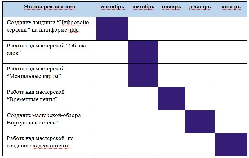 Сроки | Общее время реализации 1 год (2022/2023 уч.г.) I этап- сентябрь-октябрь; II этап- ноябрь-январь; III этап- февраль-май; IV этап- июнь. |