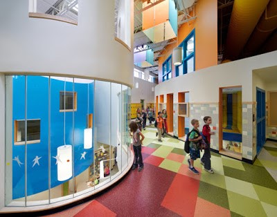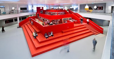Библиотека в виде красной пирамиды майя находится в центре помещения школы, на пересечении всех основных путей, служащих усилению ее роли в школьной жизни детей.