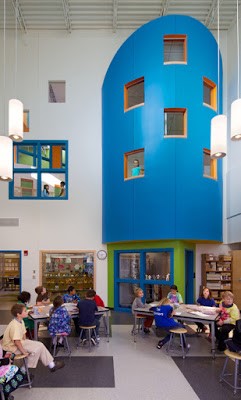 Библиотека для учеников начальной школы состоит из закрытого пространства с множеством уютных уголков со специальными местами для чтения вслух.